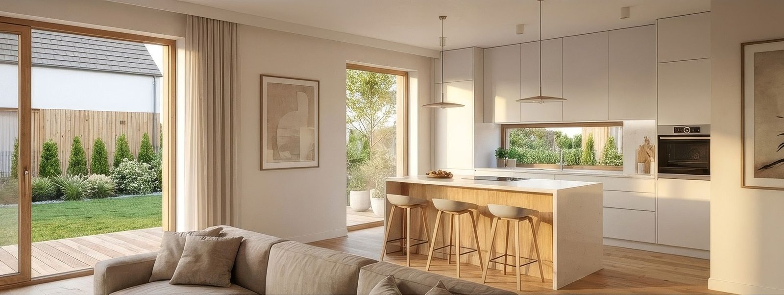 To przestrzeń zaprojektowana z myślą o codziennym komforcie – z jasną strefą dzienną, prywatną częścią na piętrze i ogrodem, który staje się naturalnym przedłużeniem domu.